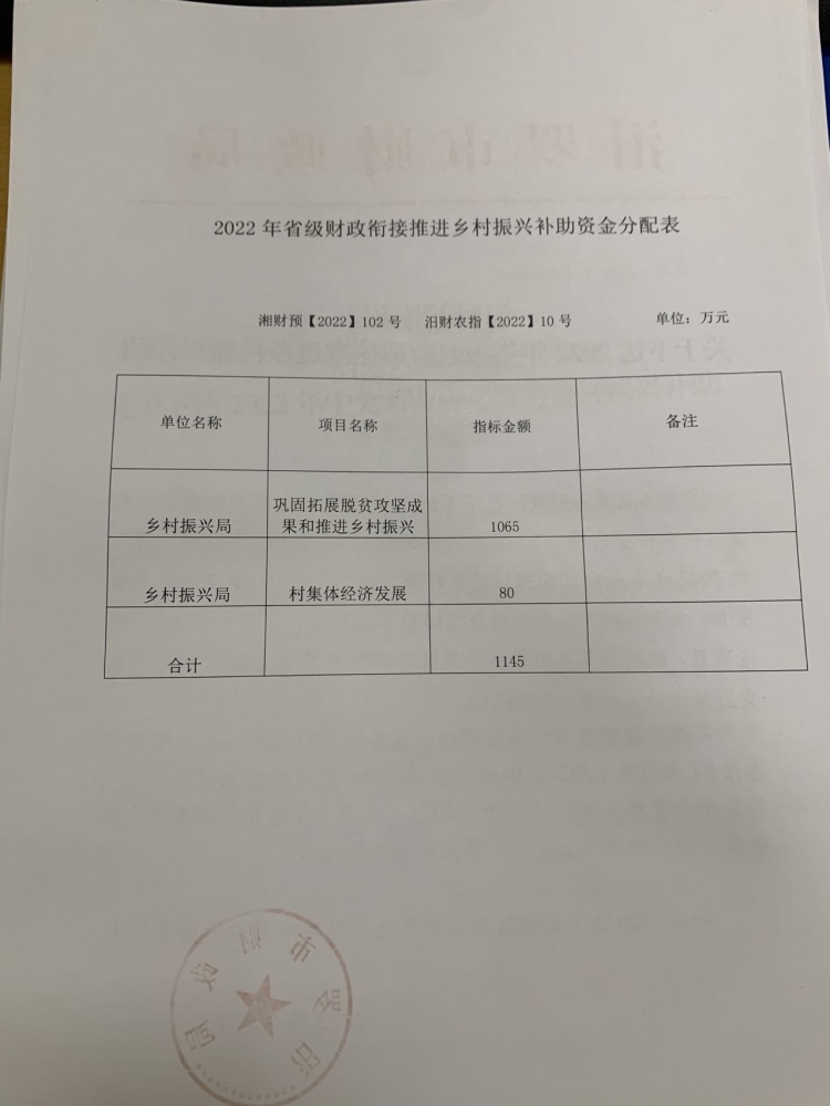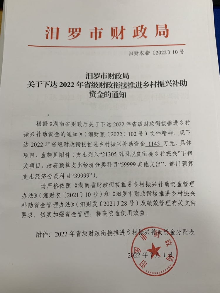 汨罗市财政局 关于下达2022年省级财政衔接推进乡村振兴补助资金的通知