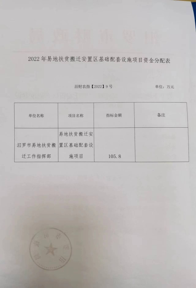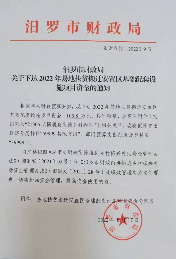 汨罗市财政局关于下达2022年易地扶贫搬迁安置区基础配套设施项目资金的通知