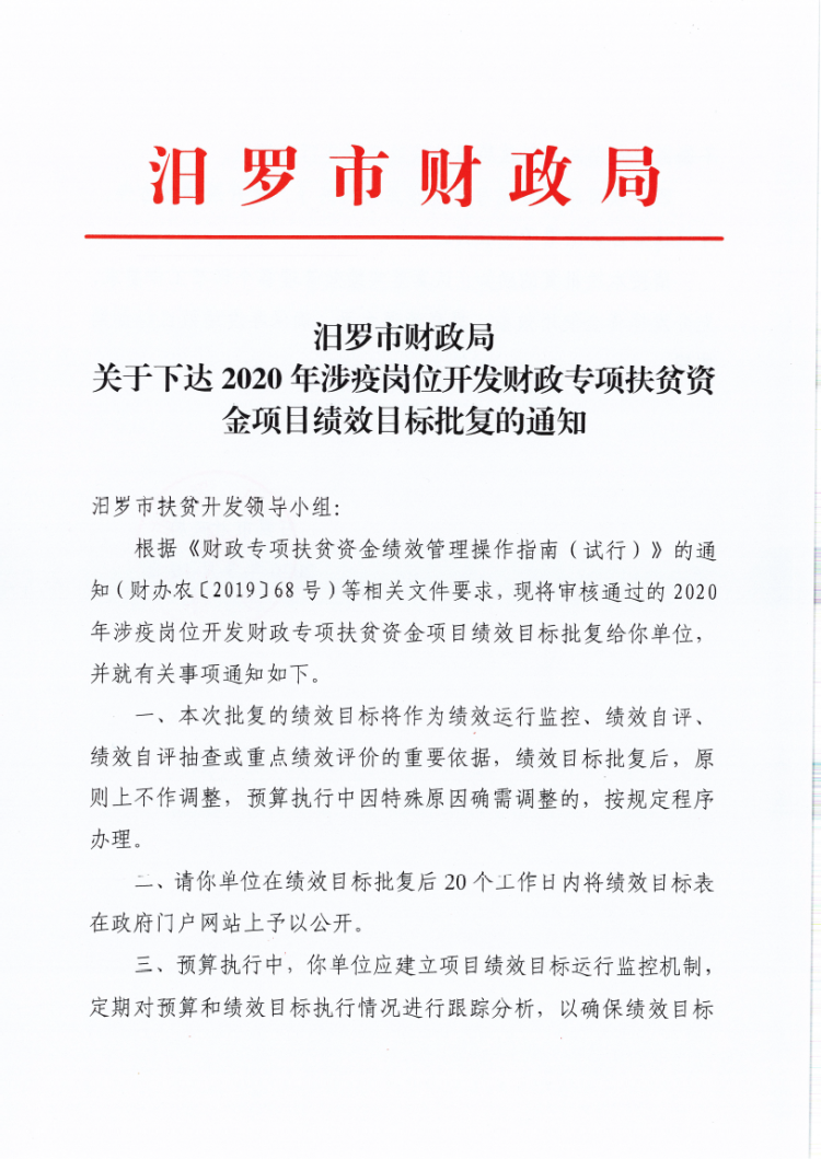 汨罗市财政局关于下达2020年涉疫岗位开发财政专项扶贫资金项目绩效目标批复的通知