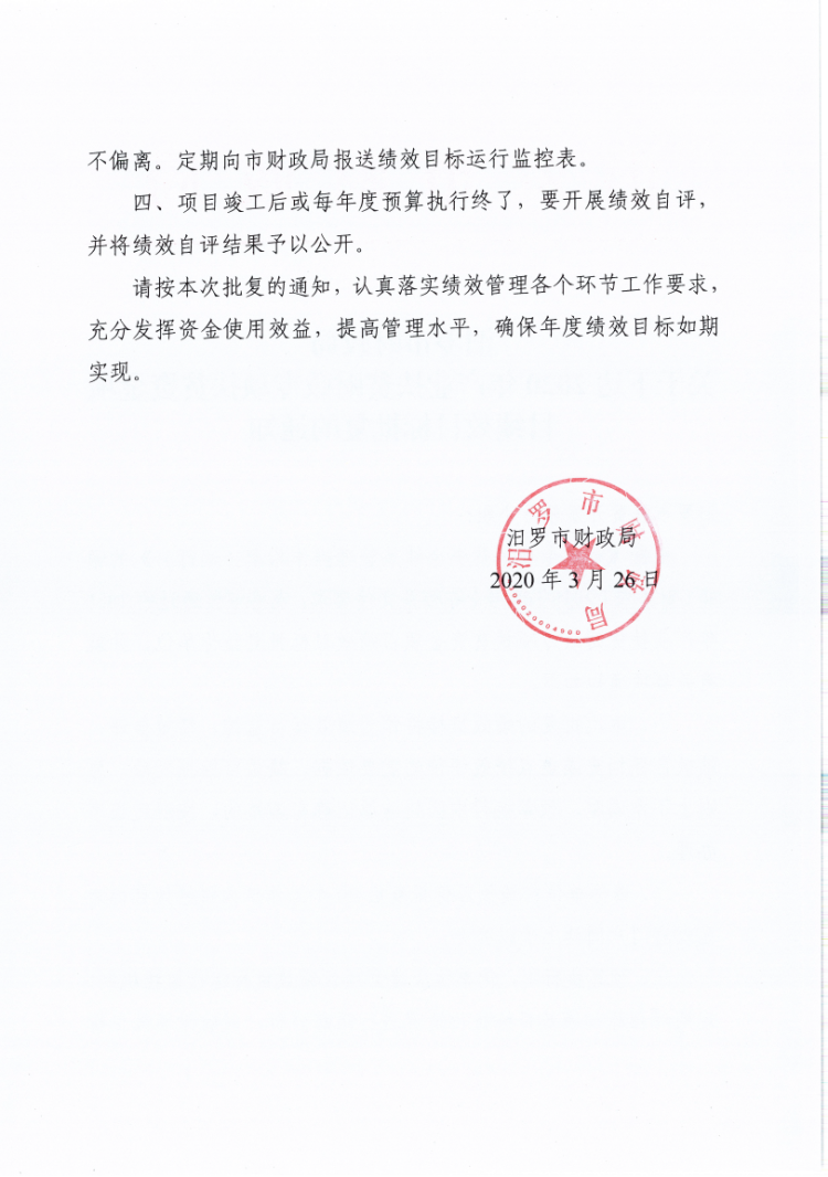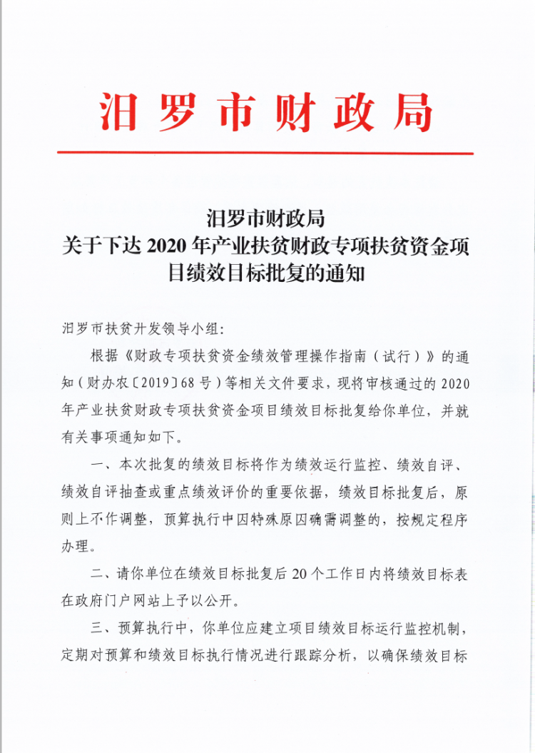汨罗市财政局关于下达2020年产业扶贫财政专项扶贫资金项目绩效目标批复的通知