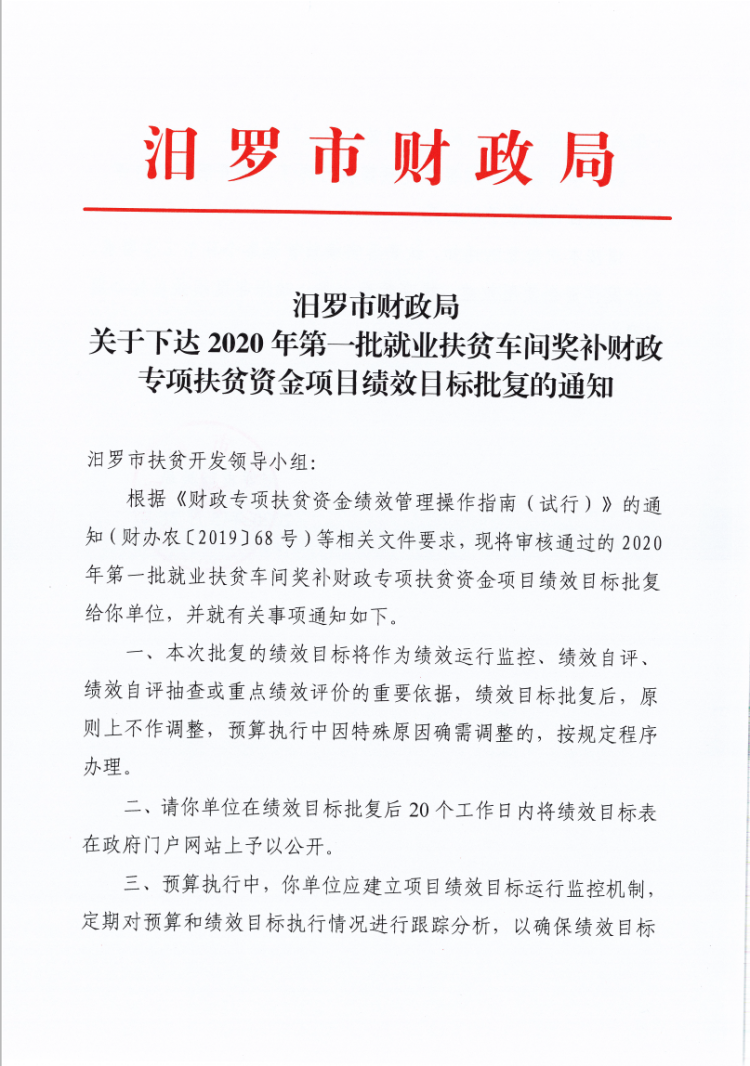 汨罗市财政局关于下达2020年第一批就业扶贫车间奖补财政专项扶贫资金项目绩效目标批复的通知