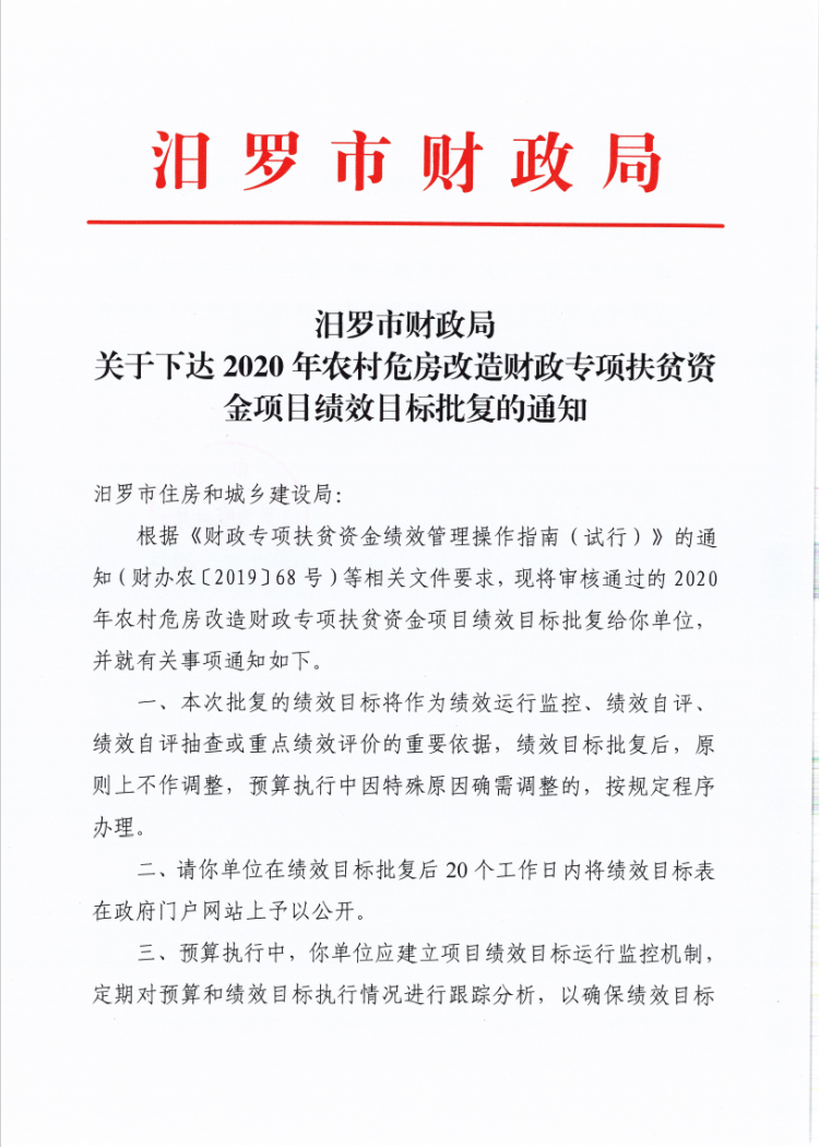 汨罗市财政局关于下达2020年农村危房改造财政专项扶贫资金项目绩效目标批复的通知