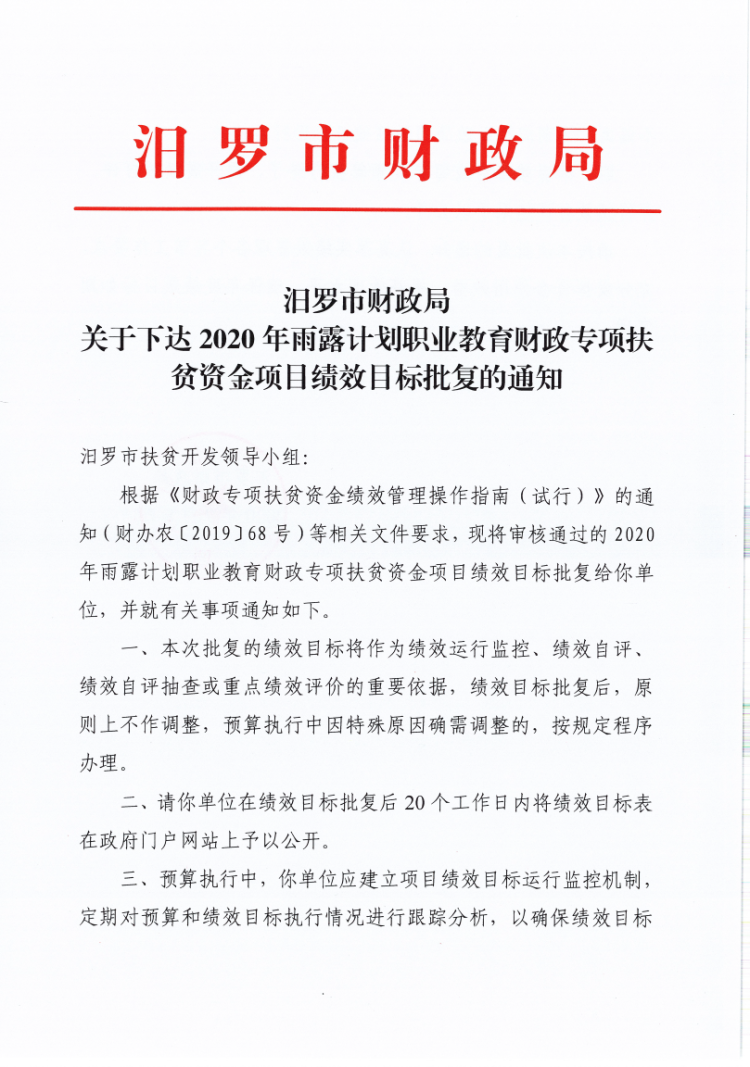 汨罗市财政局关于下达2020年雨露计划职业教育财政专项扶贫资金项目绩效目标批复的通知