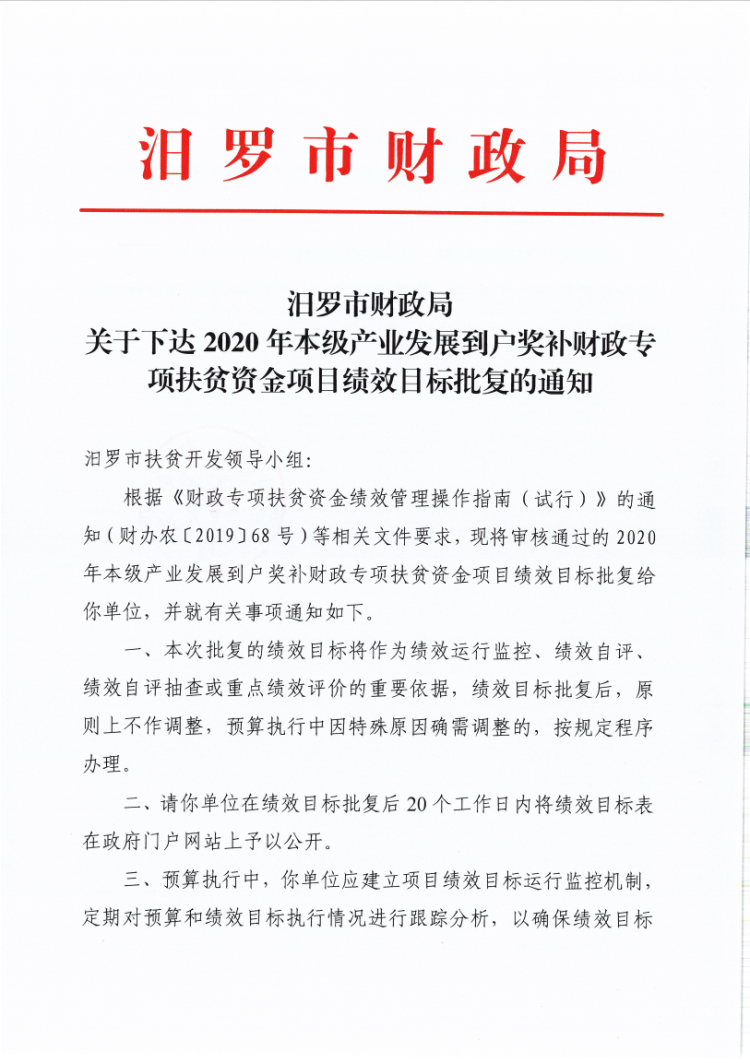 汨罗市财政局关于下达2020年本级产业发展到户奖补财政专项扶贫资金项目绩效目标批复的通知
