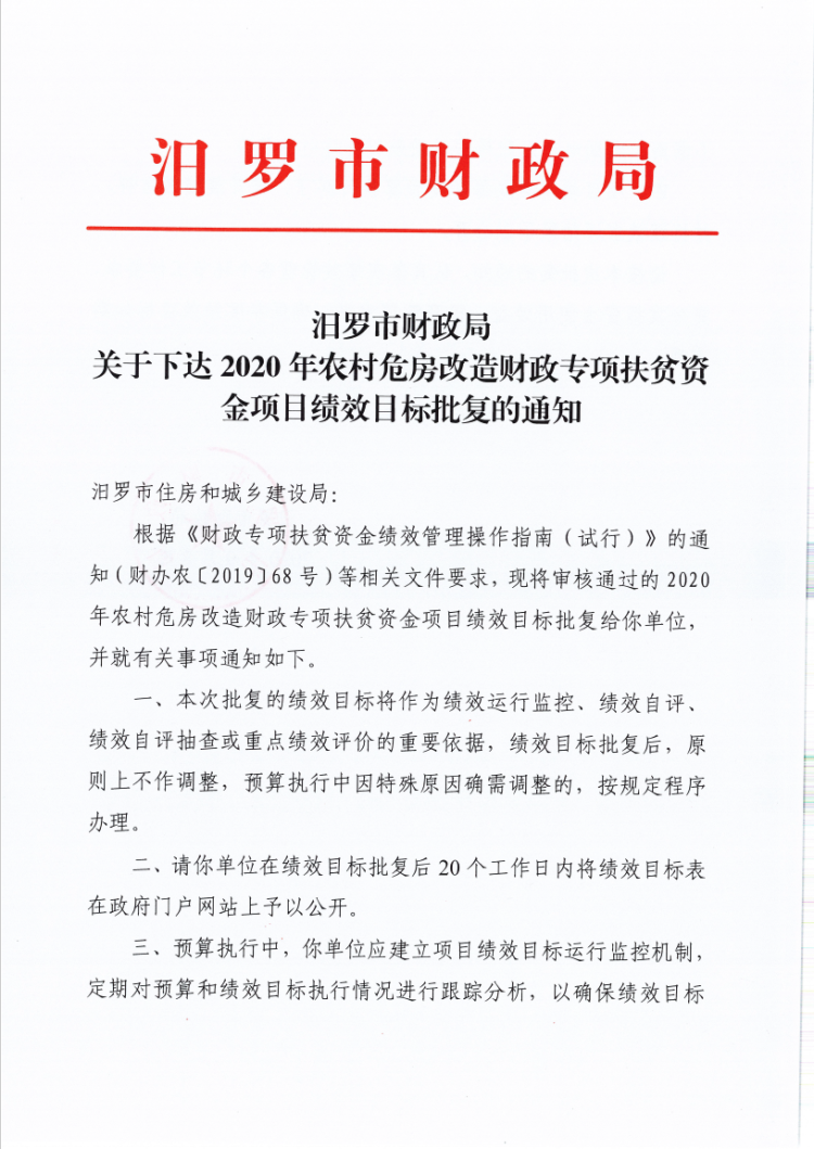汨罗市财政局关于下达2020年农村危房改造财政专项扶贫资金项目绩效目标批复的通知