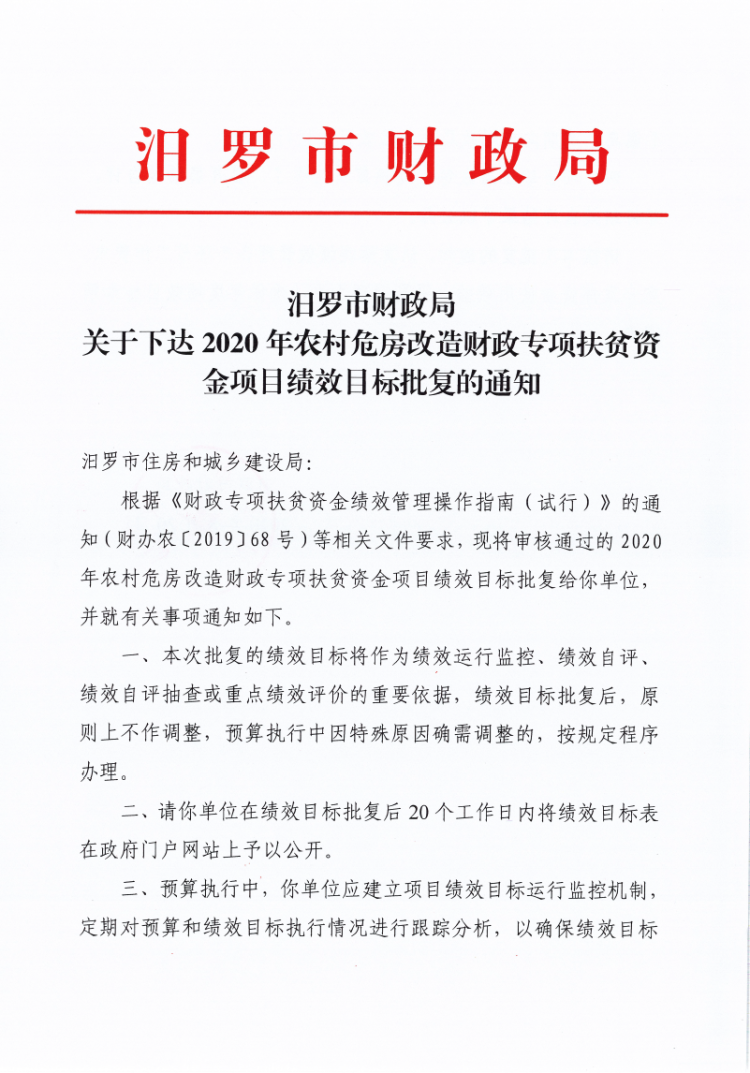 汨罗市财政局关于下达2020年农村危房改造财政专项扶贫资金项目绩效目标批复的通知