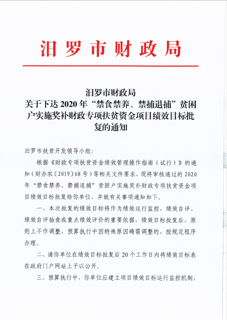 汨罗市财政局关于下达2020年 “禁食禁养、 禁捕退捕” 贫困户实施奖补财政专项扶贫资金项目绩效目标批复的通知