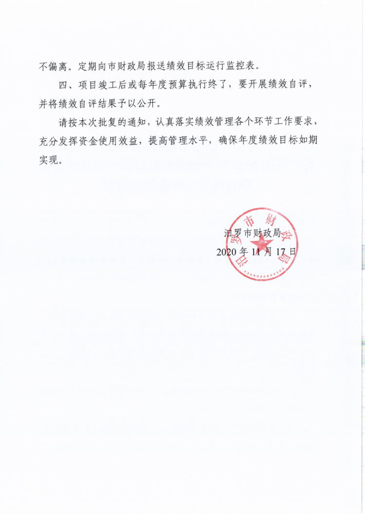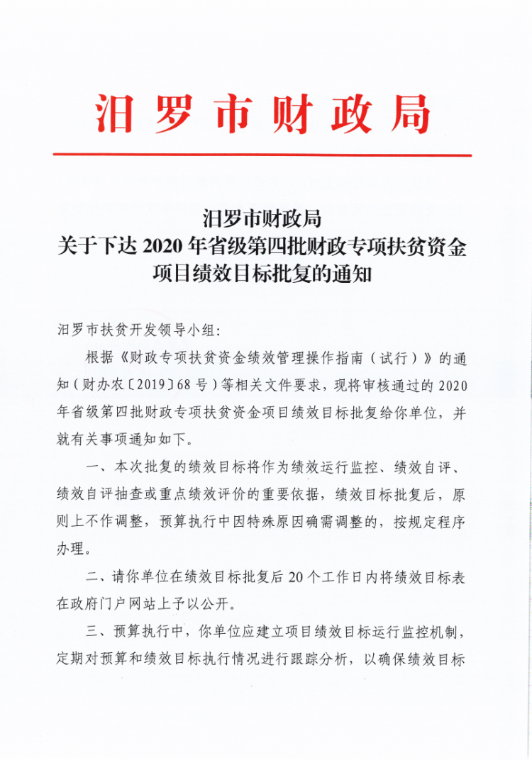 汨罗市财政局关于下达2020年省级第四批财政专项扶贫资金项目绩效目标批复的通知