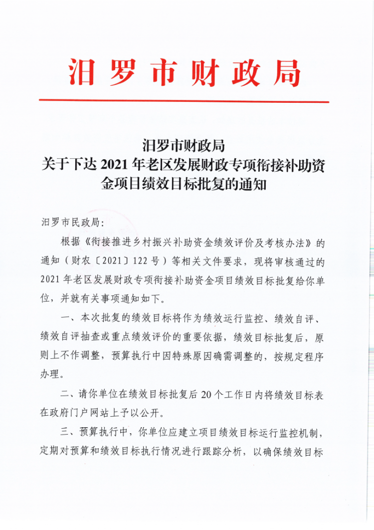汨罗市财政局关于下达2021年老区发展财政专项扶贫资金项目绩效目标批复的通知