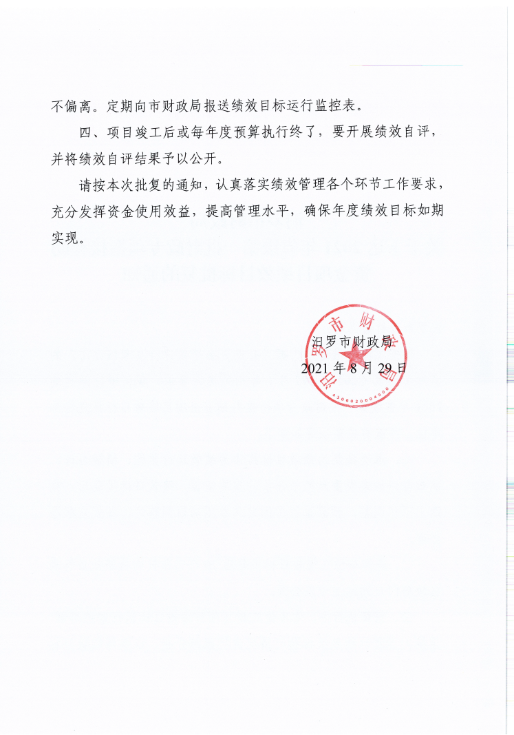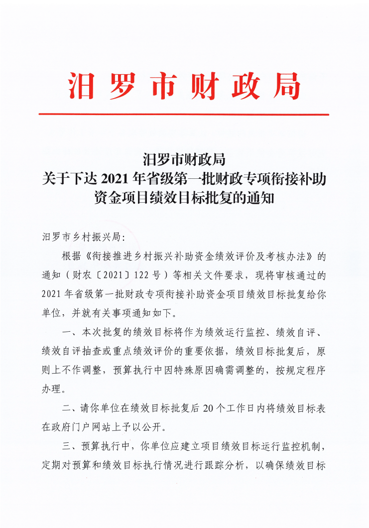 汨罗市财政局关于下达2021年省级第一批财政专项衔接补助资金项目绩效目标批复的通知