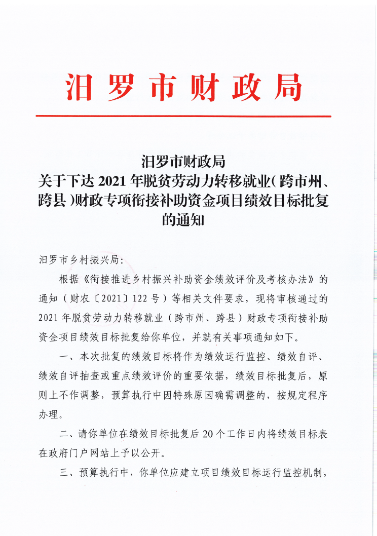 汨罗市财政局关于下达2021年脱贫劳动力转移就业(跨市州、跨县)财政专项衔接补助资金项目绩效目标批复的通知