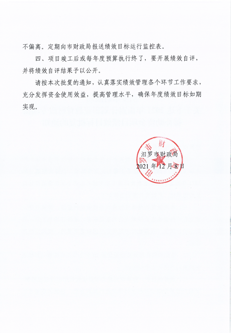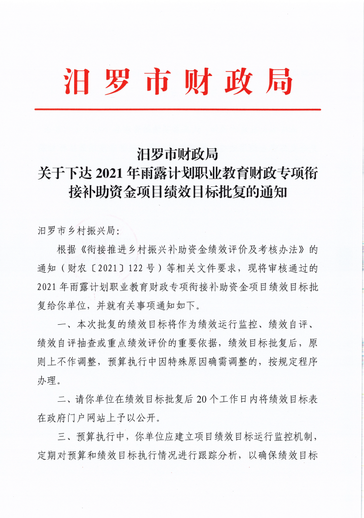 汨罗市财政局 关于下达2021年雨露计划职业教育财政专项衔接补助资金项目绩效目标批复的通知