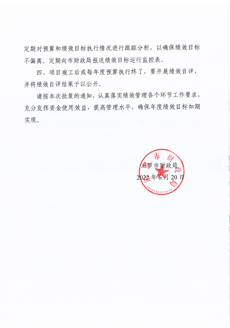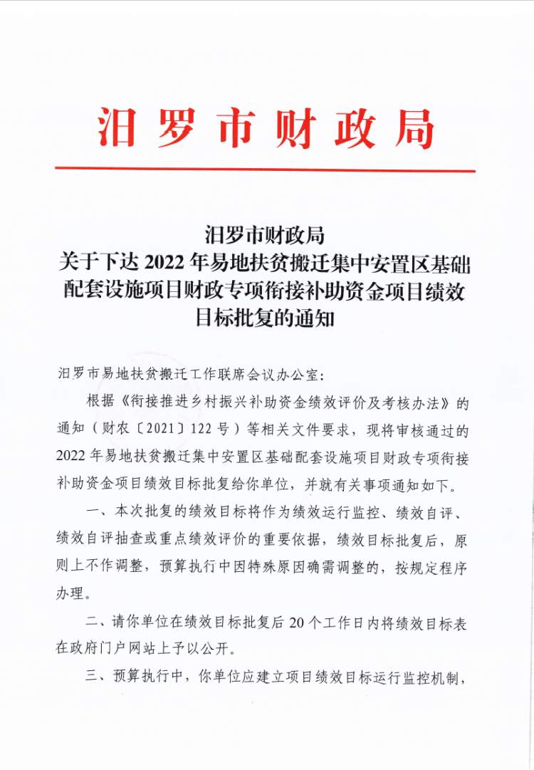 汨罗市财政局关于下达2022年易地扶贫搬迁集中安置区基础配套设施项目财政专项衔接补助资金项目绩效目标批复的通知