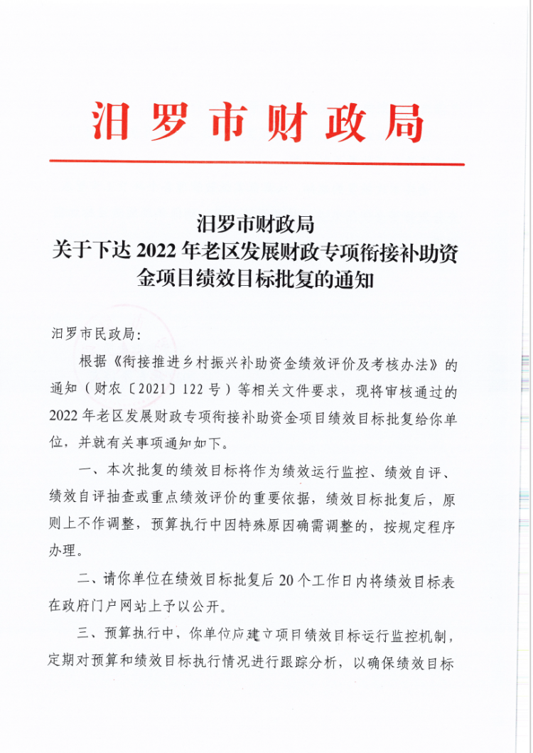 汨罗市财政局关于下达2022年老区发展财政专项衔接补助资金项目绩效目标批复的通知