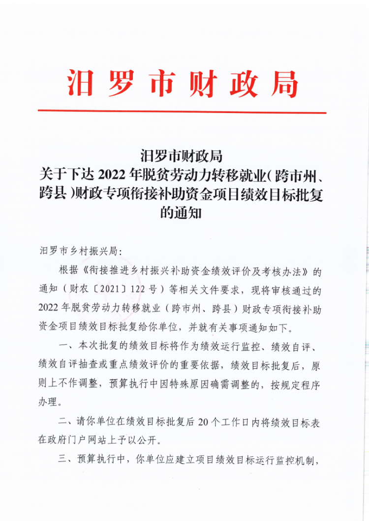 汨罗市财政局关于下达2022年脱贫劳动力转移就业(跨市州、跨县)财政专项衔接补助资金项目绩效目标批复的通知