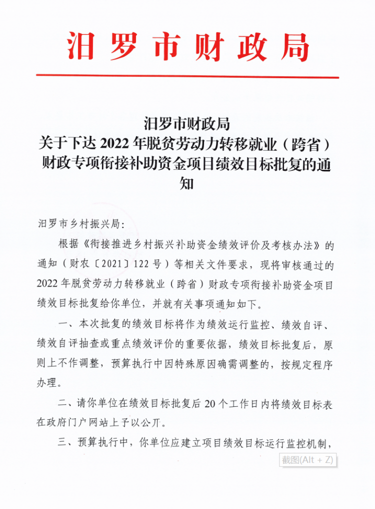 汨罗市财政局关于下达2022年脱贫劳动力转移就业(跨省)财政专项衔接补助资金项目绩效目标批复的通知