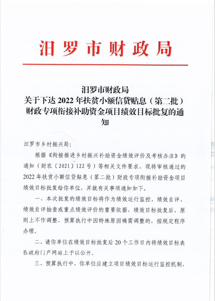 汨罗市财政局关于下达2022年扶贫小额信贷贴息(第二批)财政专项衔接补助资金项目绩效目标批复的通知
