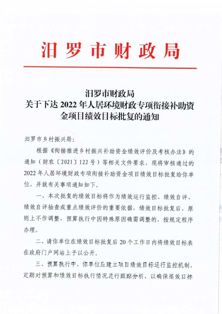 汨罗市财政局关于下达2022年人居环境财政专项衔接补助资金项目绩效目标批复的通知