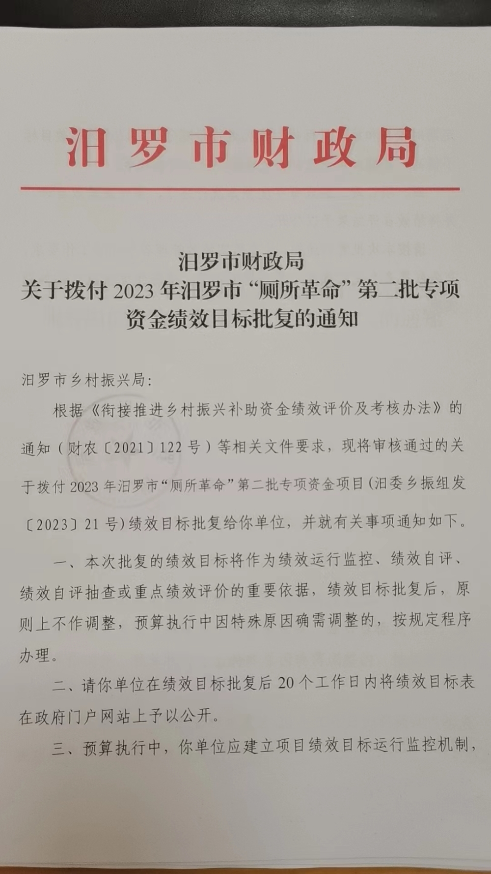 关于拨付2023年汨罗市“厕所革命”第二批专项资金绩效目标批复的通知