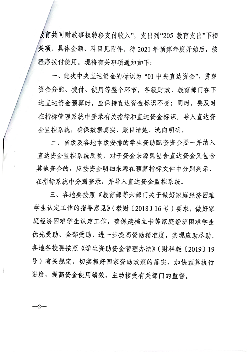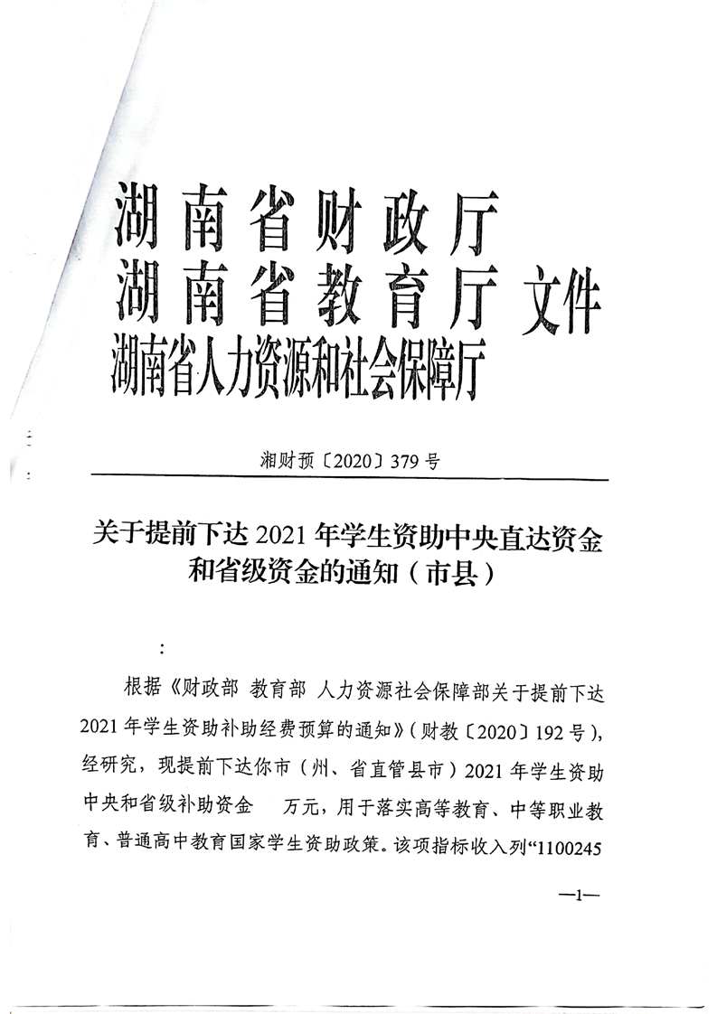379号关于下达提前下达2021年学生资助中央直达资金和省级资金