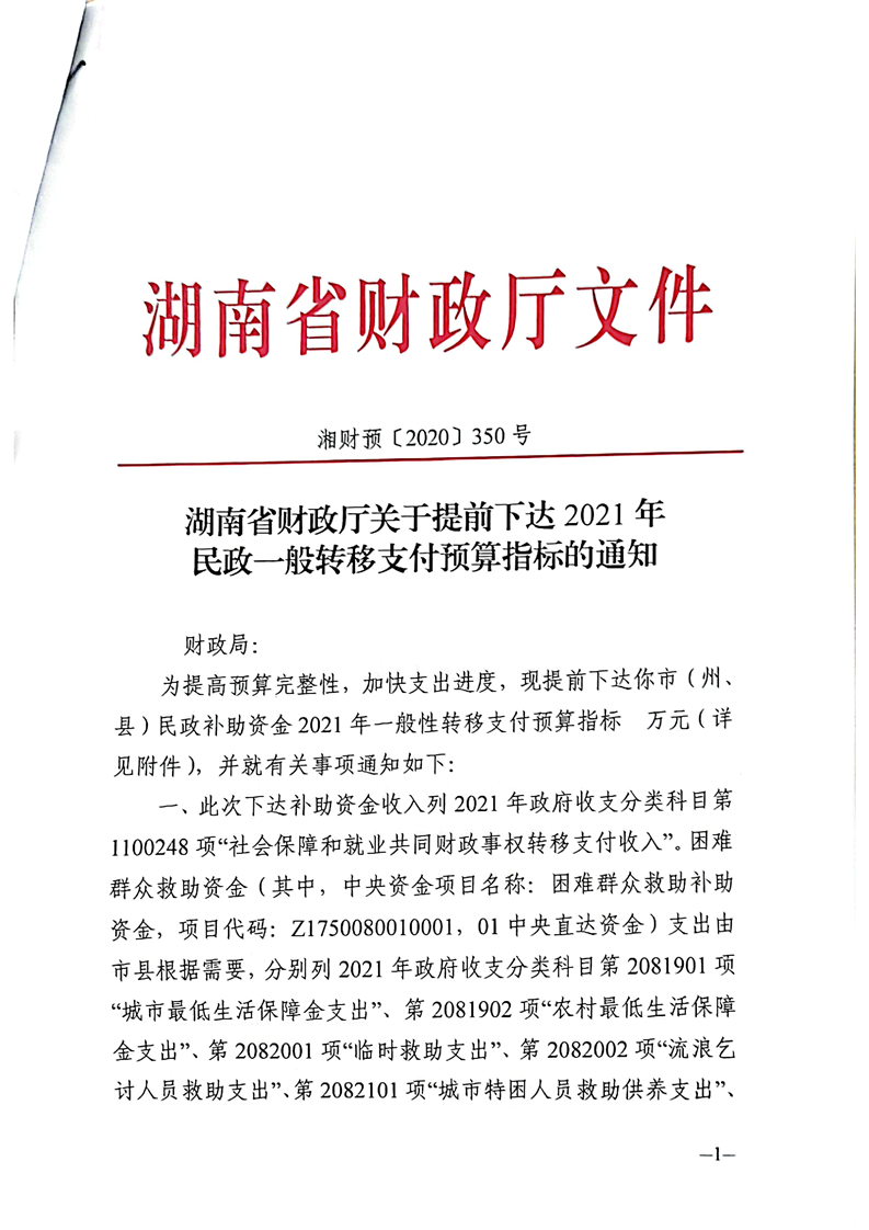 350号关于下达提前下达2021年民政一般转移支付预算指标的通知