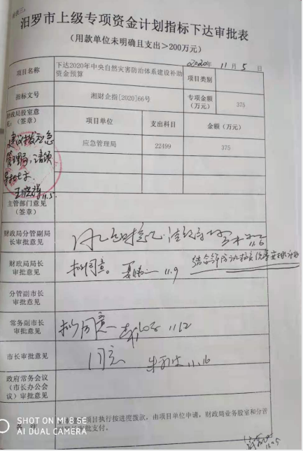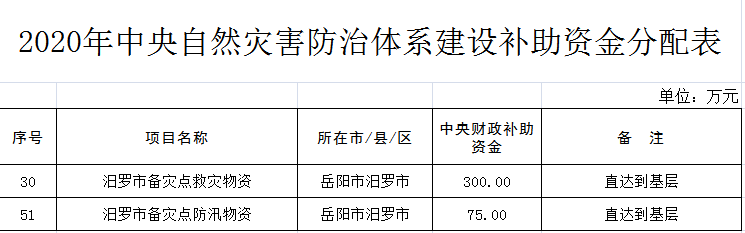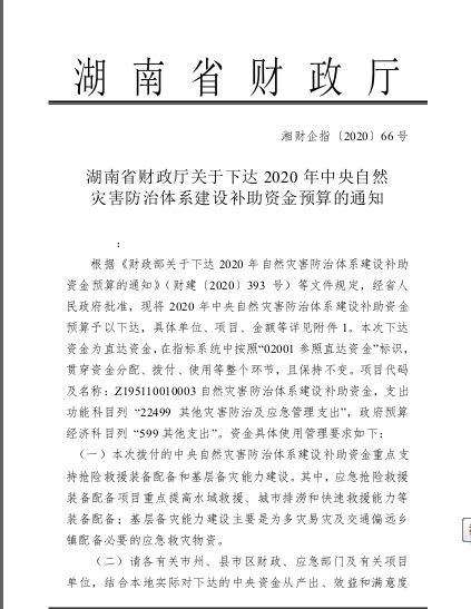 湖南省财政厅关于下达2020年中央自然灾害防治体系建设补助资金预算的通知