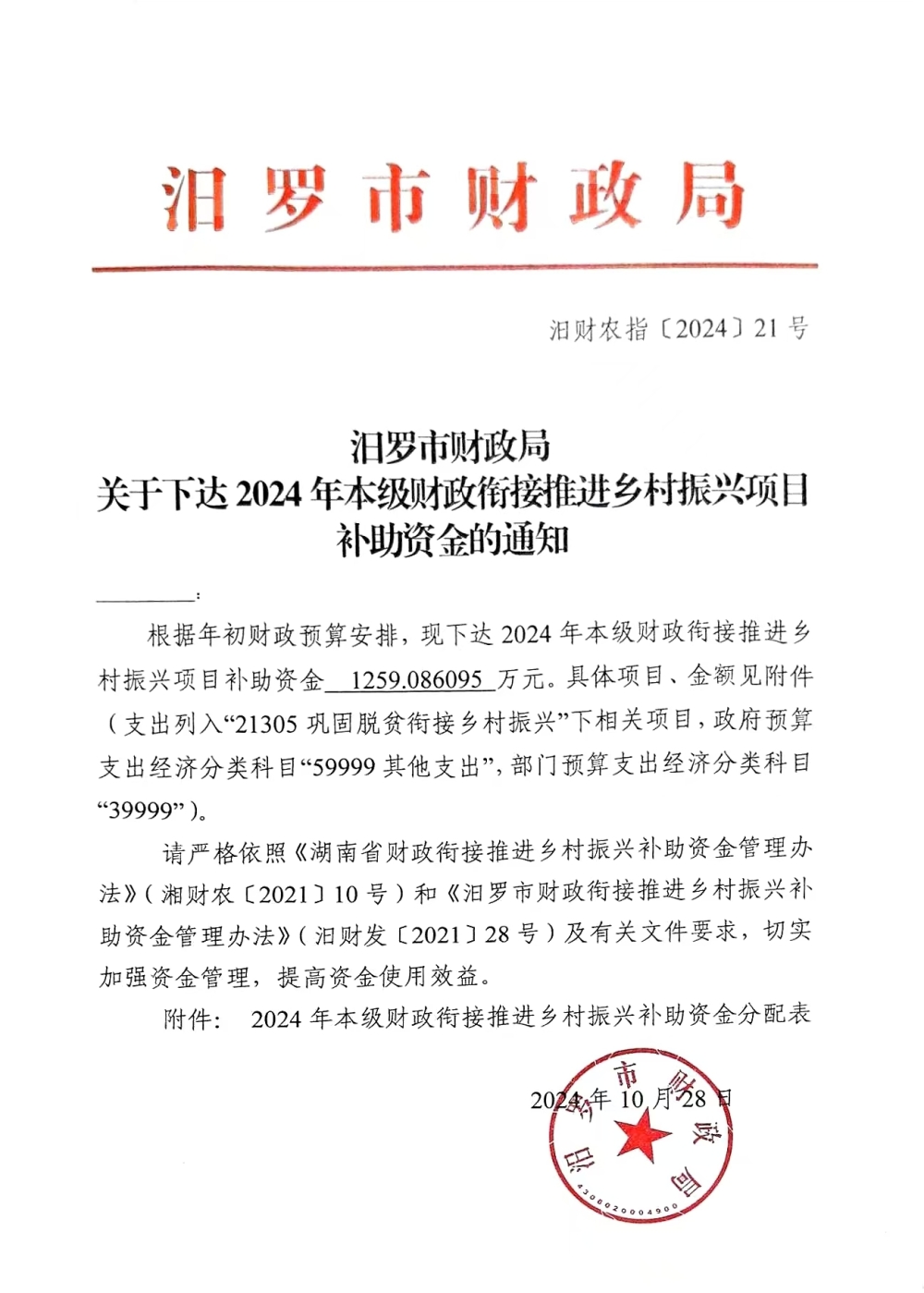 关于下达2024年本级财政衔接推进乡村振兴项目补助资金的通知
