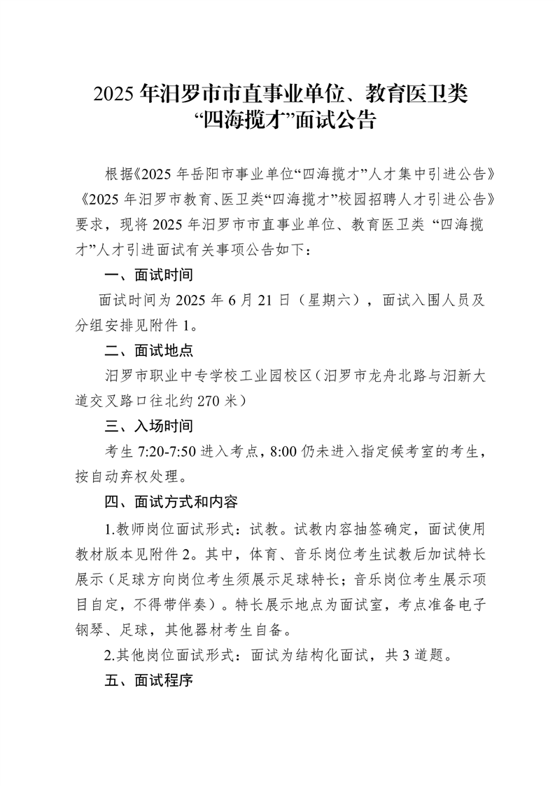 2025年汨罗市市直事业单位、教育医卫类 “四海揽才”面试公告
