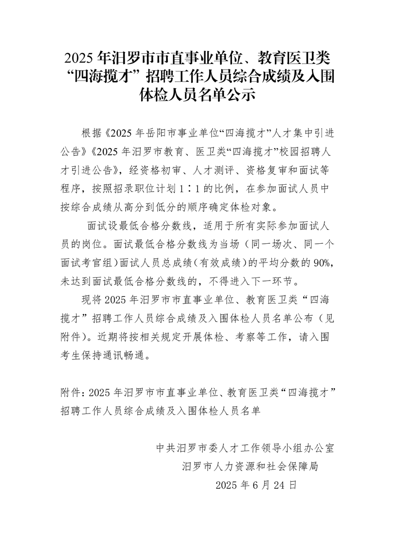 2025年汨罗市市直事业单位、教育医卫类“四海揽才”招聘工作人员综合成绩及入围体检人员名单公示