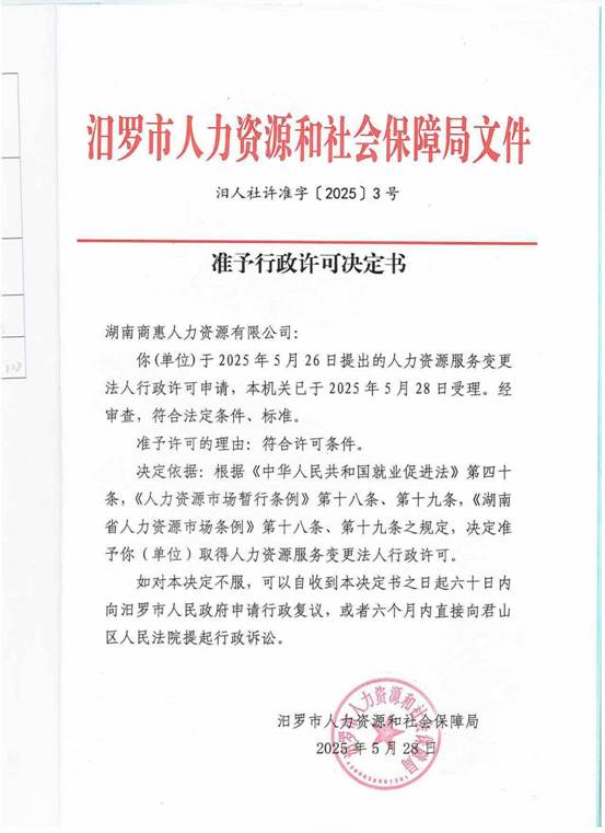 行政许可决定书汨人社许准字【2025】3号