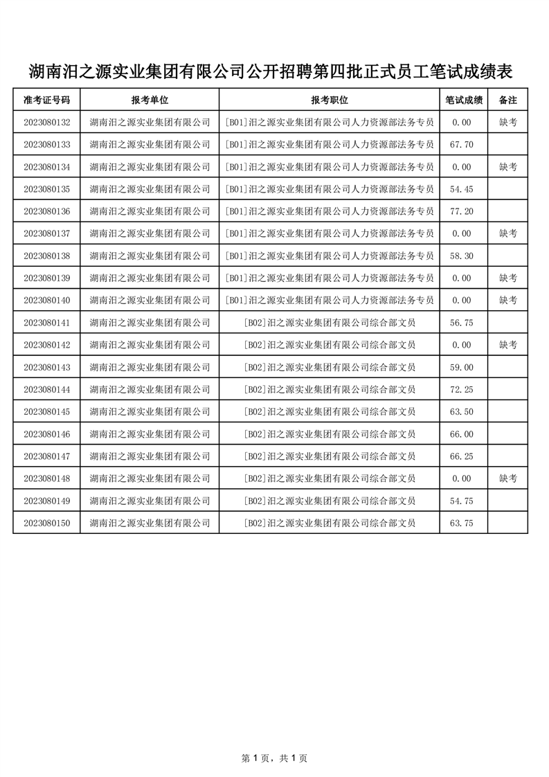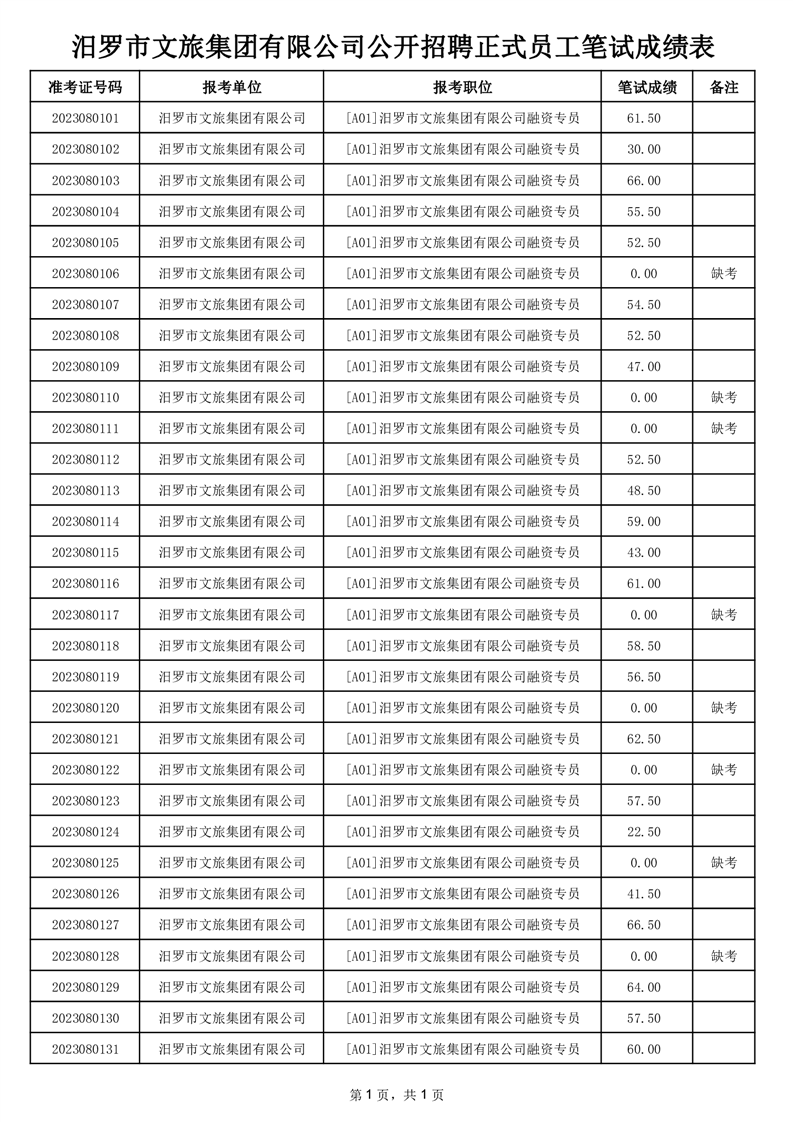 2023年汨罗市文旅集团有限公司公开招聘正式员工、湖南汨之源实业有限公司公开招聘第四批正式员工笔试成绩公示