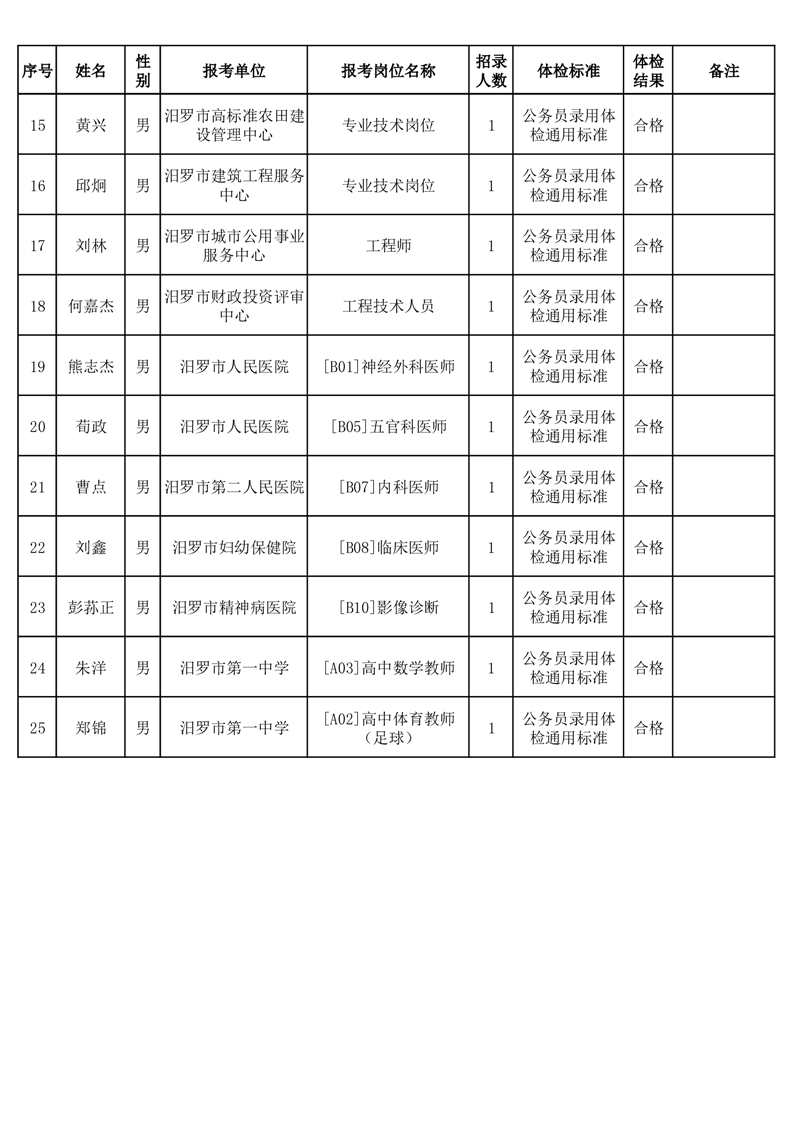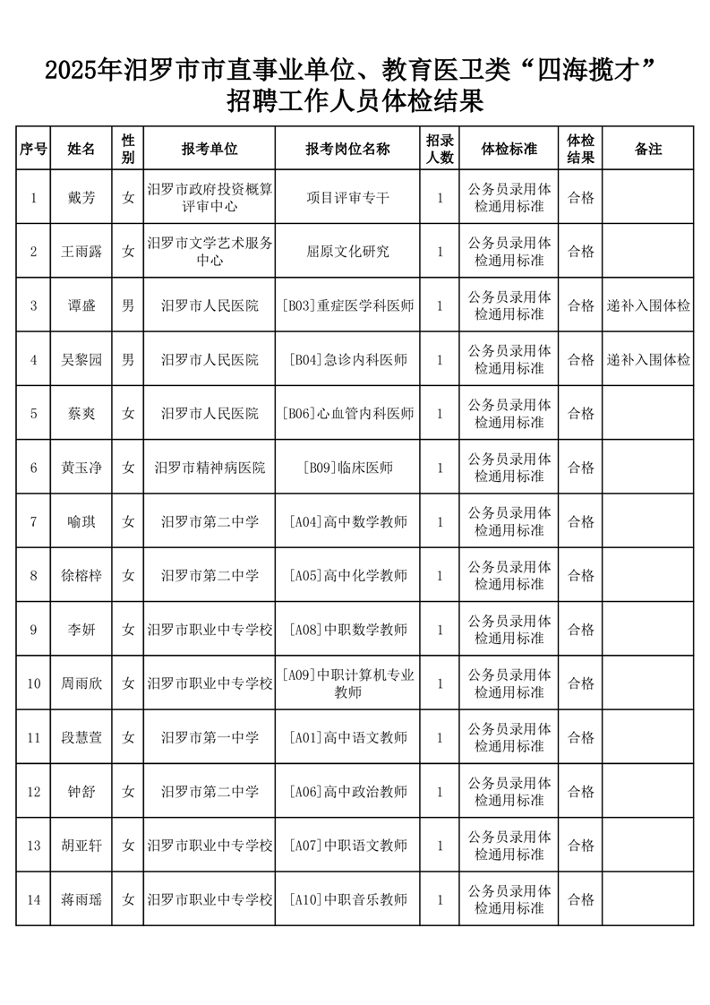 2025年汨罗市市直事业单位、教育医卫类“四海揽才” 招聘工作人员体检结果公示