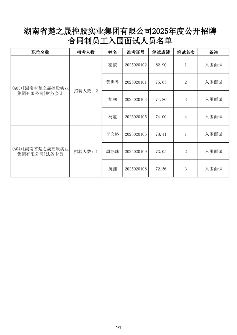 湖南省楚之晟控股实业集团有限公司2025年度公开招聘合同制员工面试公告