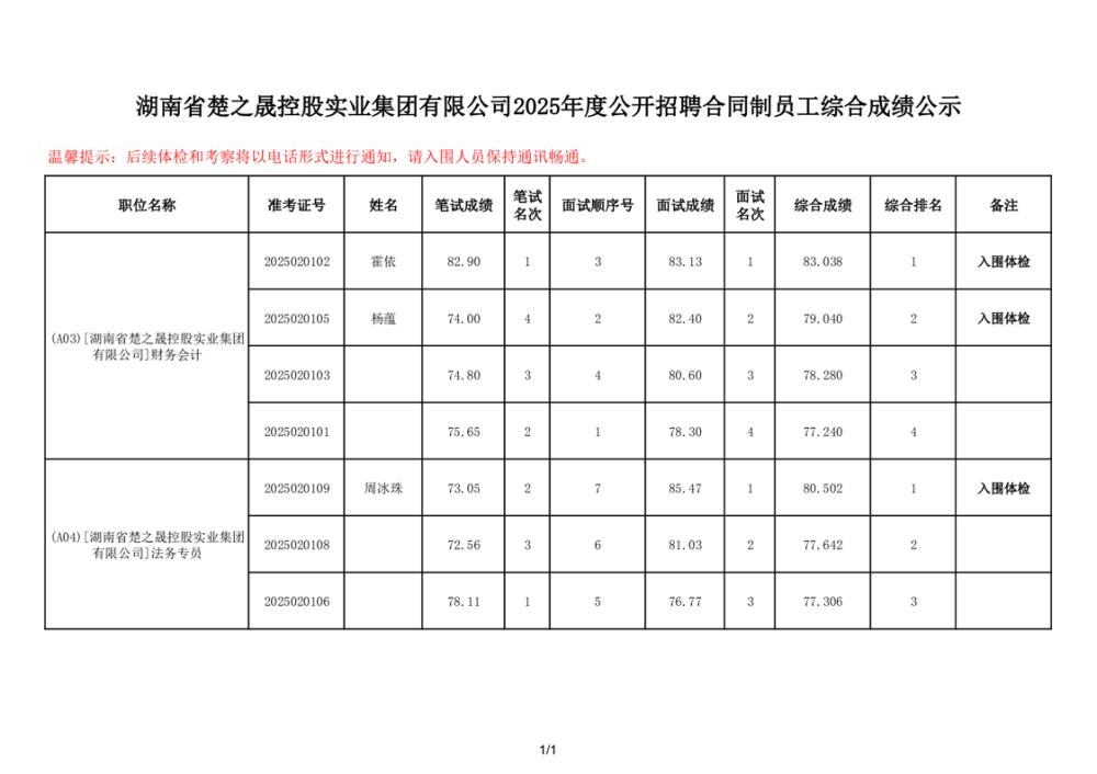 湖南省楚之晟控股实业集团有限公司2025年度公开招聘合同制员工综合成绩公示