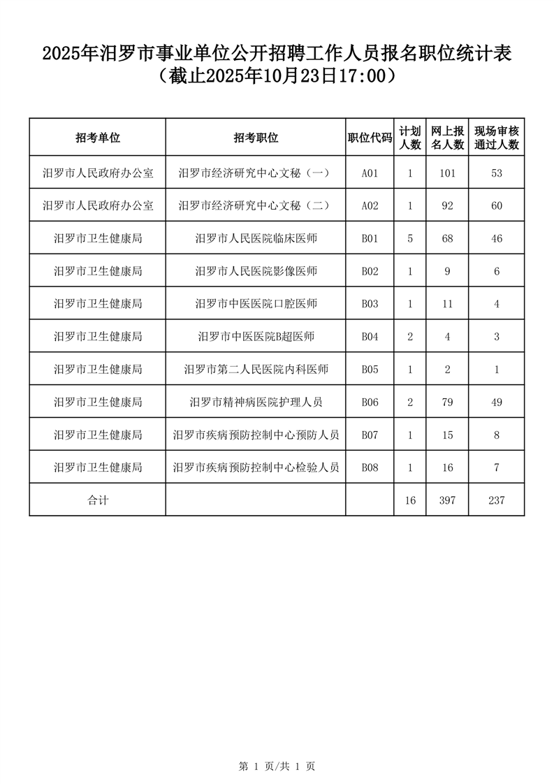 2025年汨罗市事业单位公开招聘工作人员报名职位统计表(截止2025年10月23日17:00)