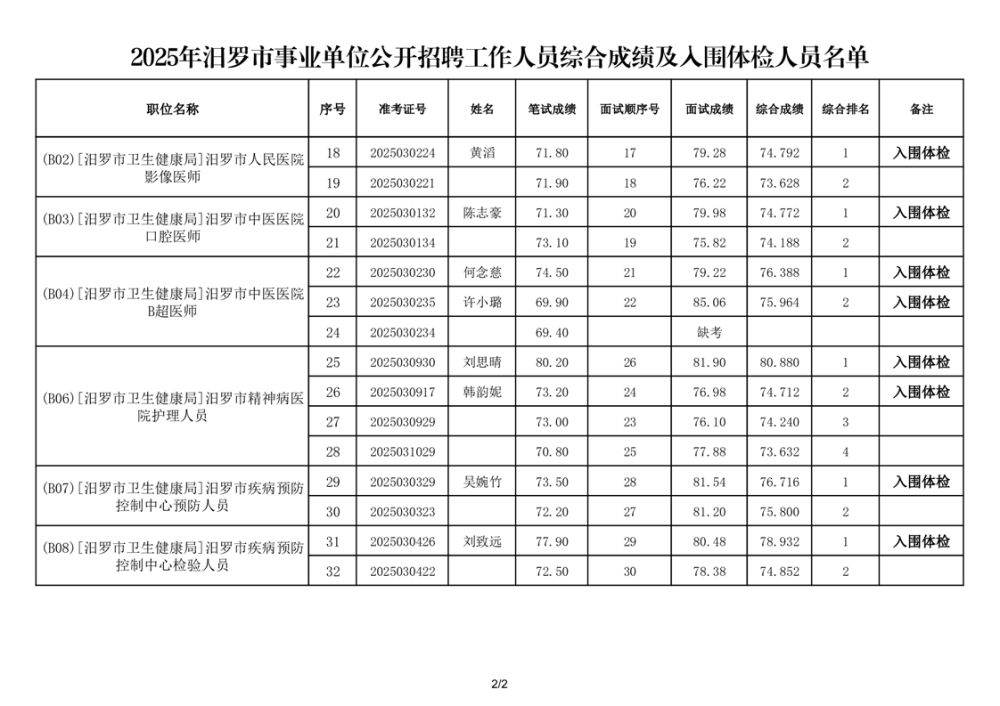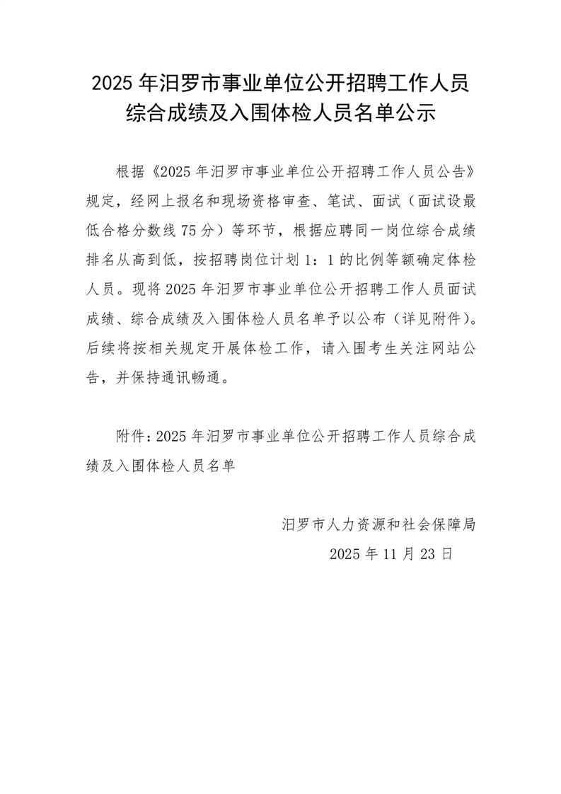 2025年汨罗市事业单位公开招聘工作人员综合成绩及入围体检人员名单公示