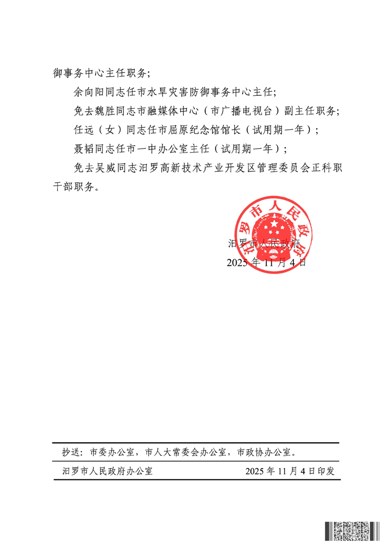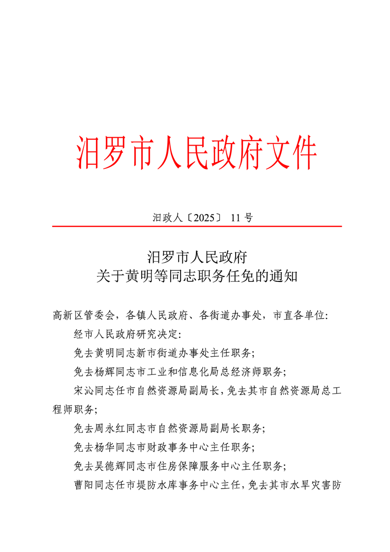 汨罗市人民政府关于黄明等同志职务任免的通知