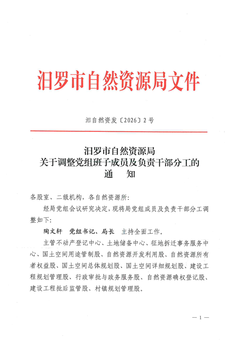 汨罗市自然资源局2026年关于调整党组班子成员及负责干部分工的通知