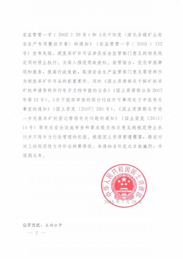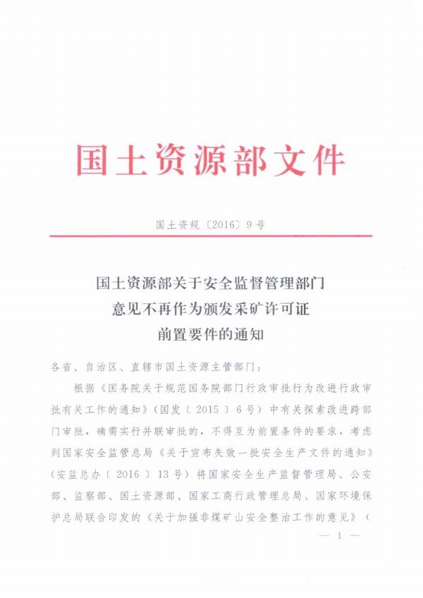 国土资源部关于安全监督管理部门意见不再作为颁发采矿许可证前置要件的通知