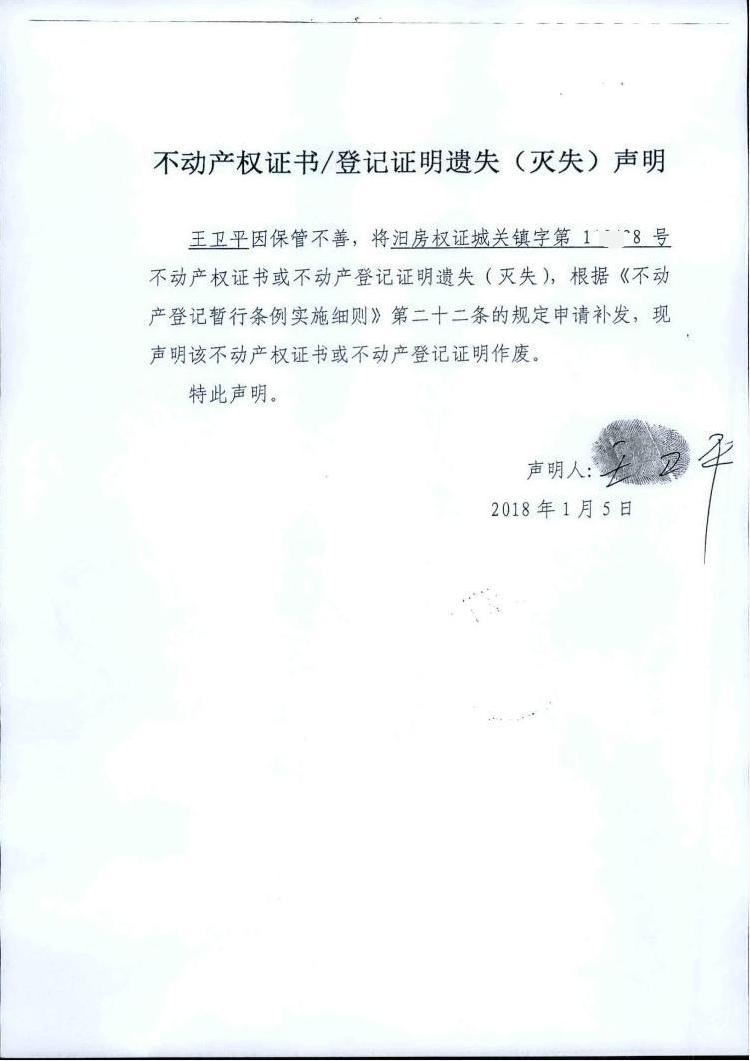 不动产权证书遗失声明(王卫平)