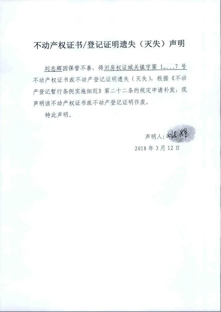 不动产权证书遗失声明(刘志辉)