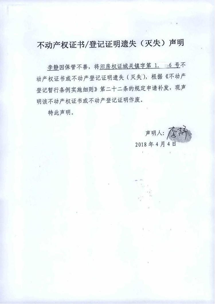不动产权证书遗失声明(李静)