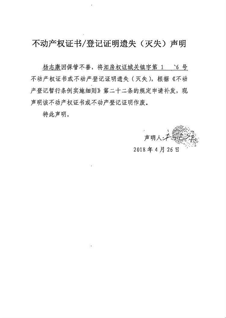 不动产权证书遗失声明(杨志康)
