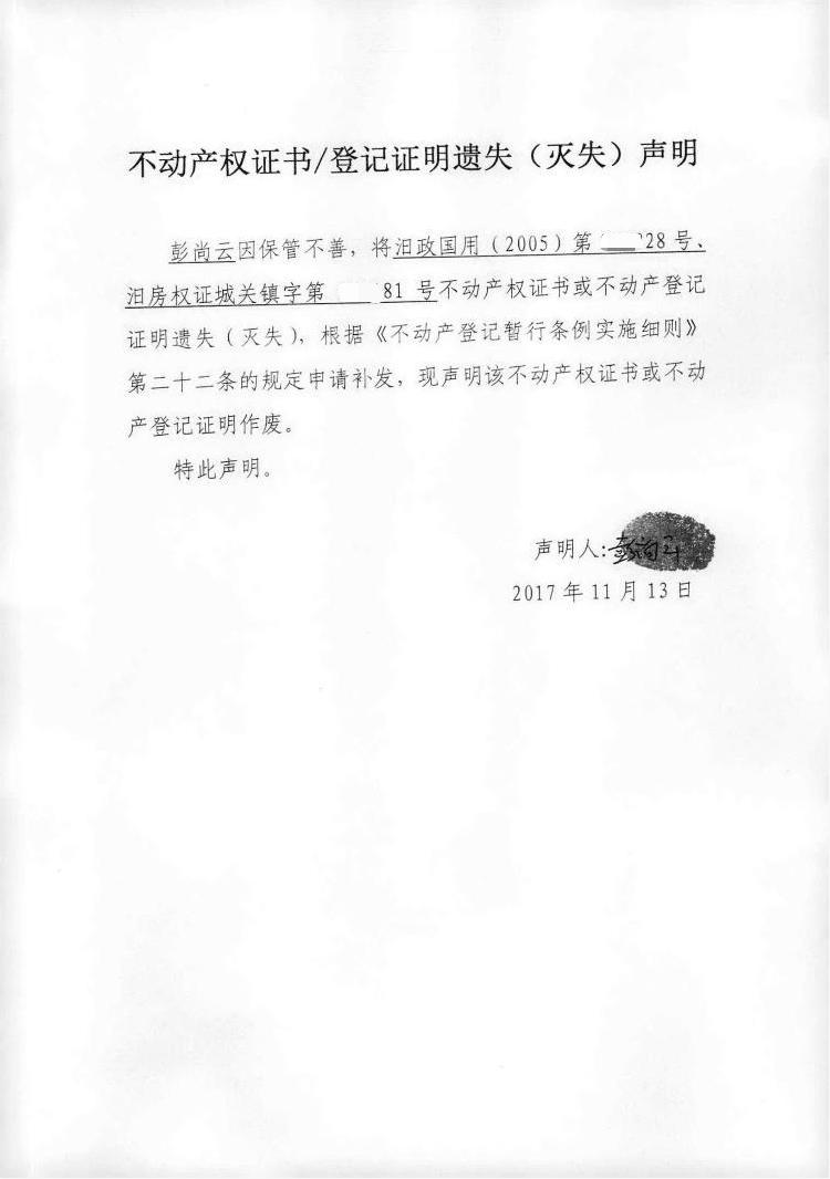 不动产权证书遗失声明(彭尚云)