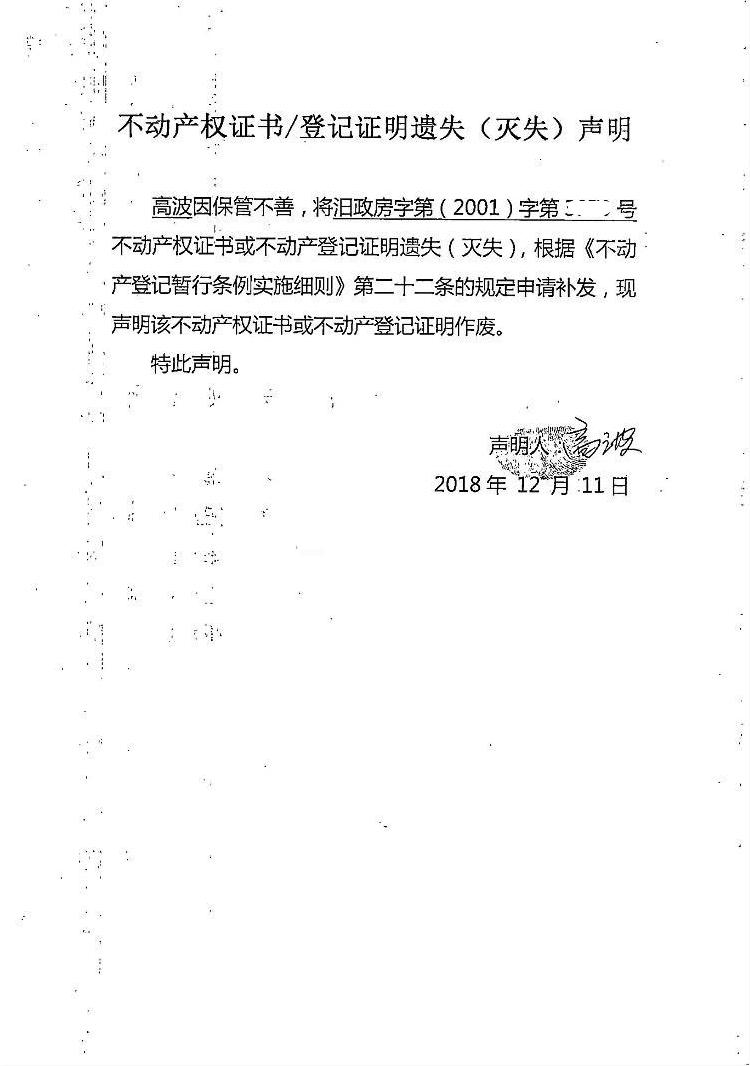 不动产权证书遗失声明(高波)