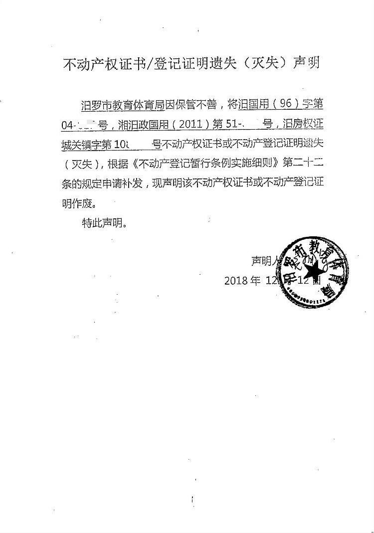 不动产权证书遗失声明(教育体育局)
