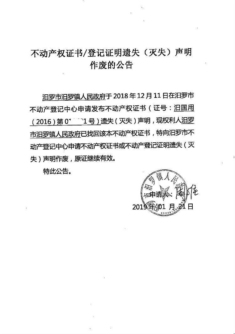 不动产权证书遗失声明作废公告(汨罗镇人民政府)