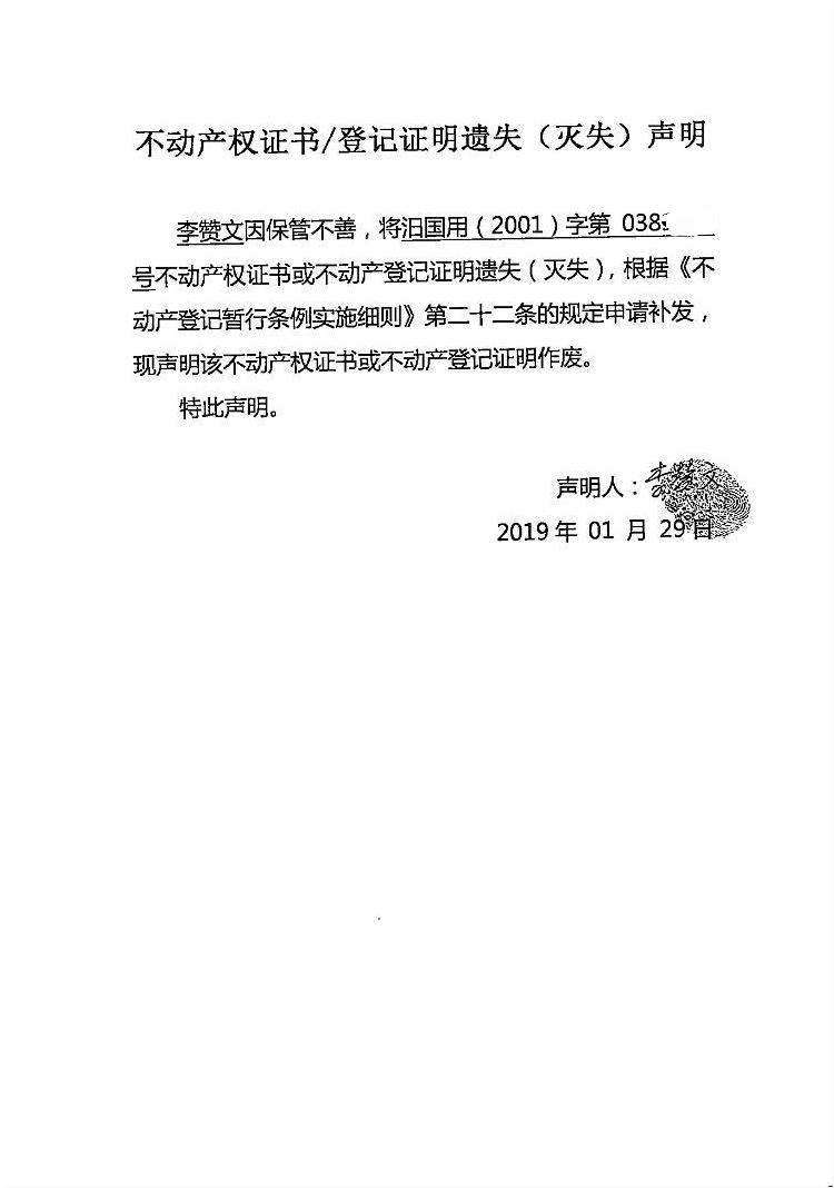 不动产权证书遗失声明(李赞文)