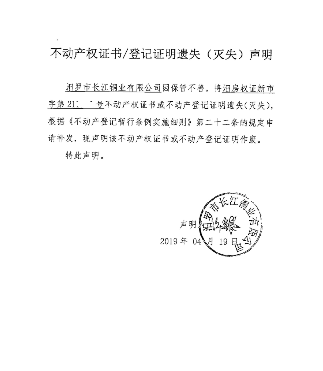 不动产权证书遗失声明(长江铜业有限公司211153)
