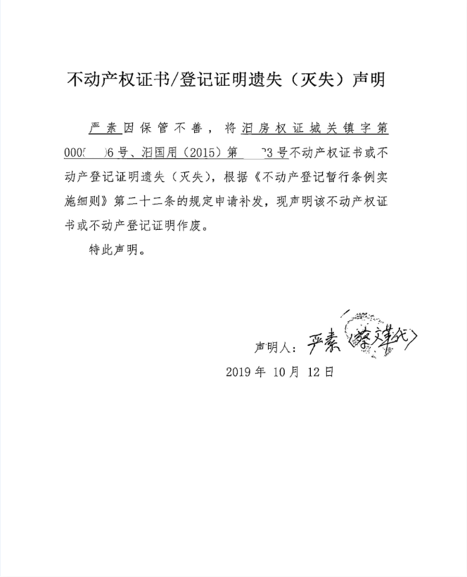 不动产权证书遗失声明(严素)